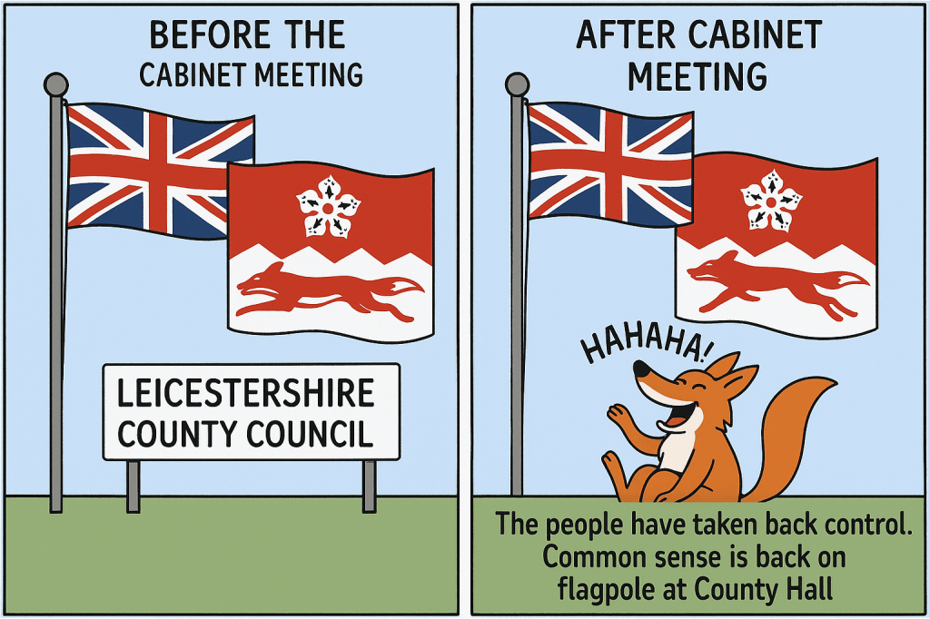 The Union Jack, the Cross of St. George and the Leicestershire flag to be precise. These are the only flags that can be flown, in addition to the Lord Lieutenant’s Flag outside County Hall on the three flag poles standing proud outside.