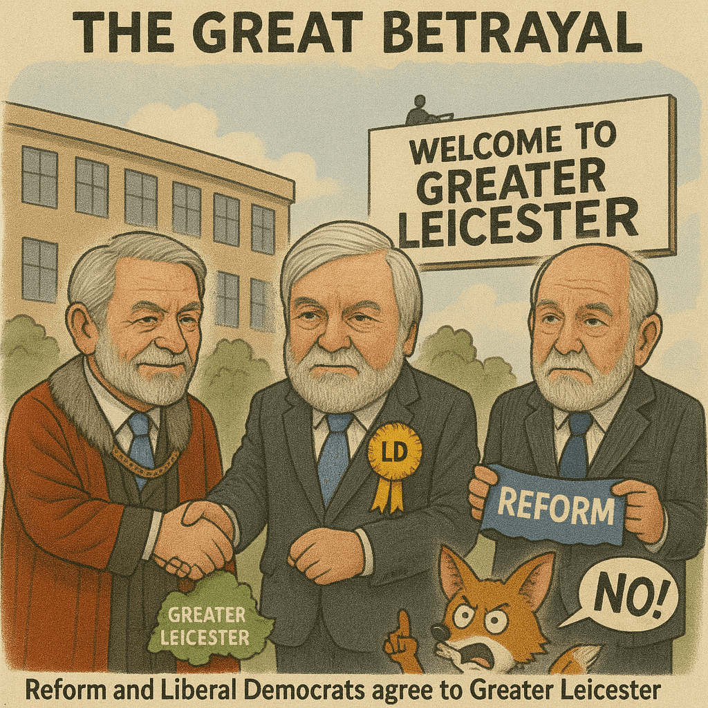 In that dark and murky world inhabited by Reform’s Cllr. Dan Harrison on the one hand, and the leaders of the boroughs and districts, including Harborough, led by Cllr. Phil Knowles, the Red Knight, Sir Peter Soulsby, Mayor of Leicester City, has revealed that despite their protestations to the contrary, they are all prepared to concede districts and boroughs to an enlarged City in what could become known as the ‘Boundary Growth Agreement’.